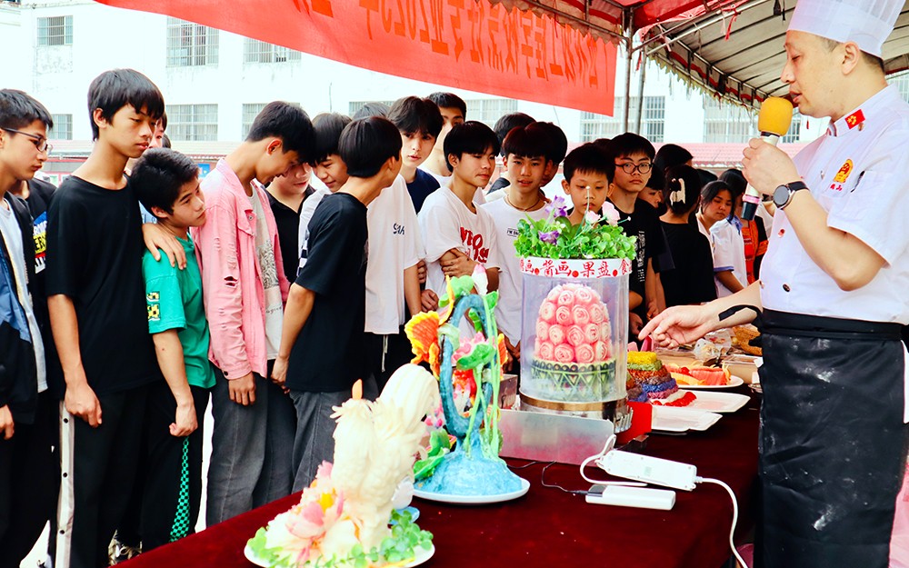 此次活动精彩纷呈,民族歌舞表演点燃节日氛围,师生美食展、趣味民族体育运动更是将活动推向高潮。我校中餐烹饪专业师生制作的富有柳州特色的浓香螺蛳粉、壮乡特色的五色糯米饭、专业特色的蛋糕、水果拼盘等美食大受欢迎,紫荆民族初中的老师同学们排起了长队,驻足品尝。在享受美食的同时,也不禁赞叹我校学生超强的动手能力。
