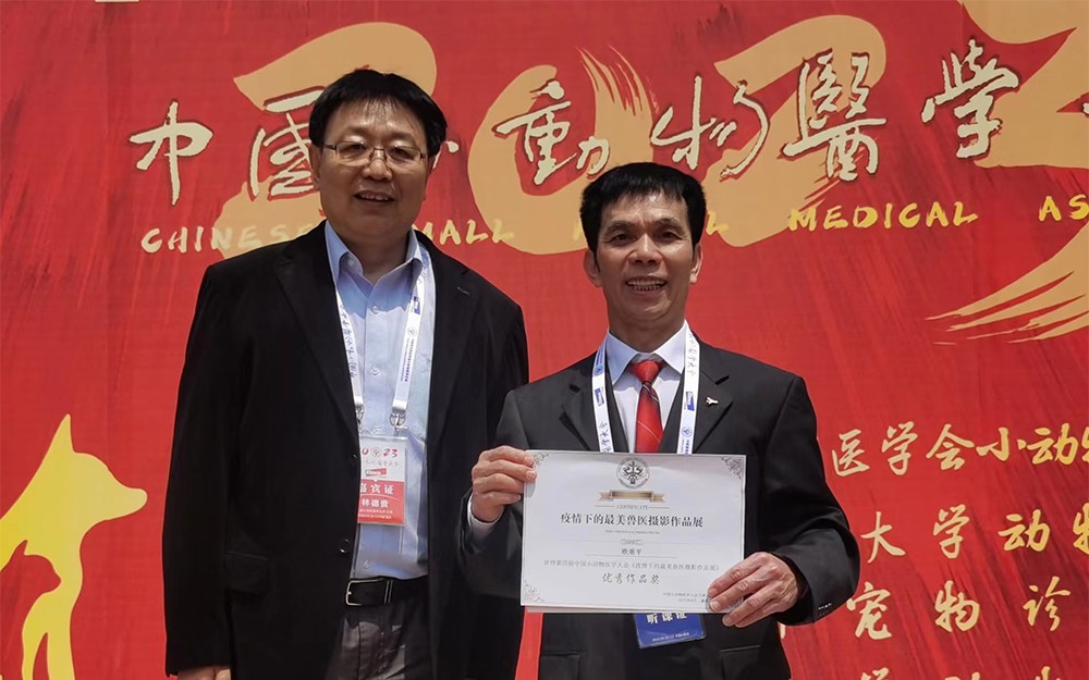 这次大会设置的疫情下最美小动物临床兽医师工作照比赛中,我校退休教师欧重平同志喜获“疫情下的最美兽医摄影优秀作品奖”。
