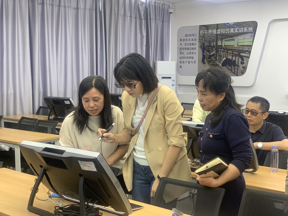 座谈会上,张丹琳副科长代表学校对玉林农校领导老师一行的到来表示热烈欢迎,并简要介绍了学校教育教学情况。双方就精品课程建设、教学资源库建设、产教融合模式、技术研发与社会服务四个内容进行深入交流。会后,张敏科长一行参观了学校校史馆、动物标本展览馆、VR虚拟仿真实训基地、教学实习牧场。