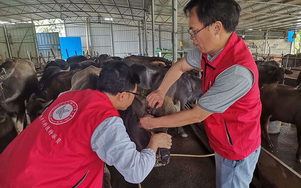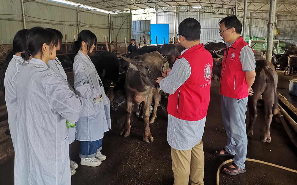 5月25日,应企业需要校科技特派员刘佑东、吕铭翰率队带领4名学生到柳州市鼎丰农业科技发展有限公司开展牛病诊疗服务。
