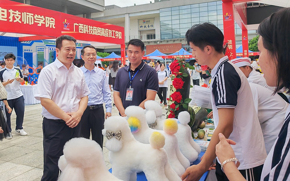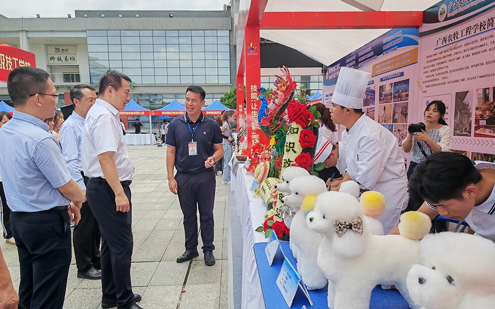 随后,领导嘉宾走进参展院校和企业联合展区,深入了解柳州市职业教育的成果和发展情况。在我校展区,招生就业办副主任韦必辉向参观的领导嘉宾介绍了中餐烹饪专业师生们制作的创新菜品和宠物养护与经营专业学生修剪的宠物“拉姆装”和“泰迪装”造型,同时详细解说了相关专业的课程设置,强调学校注重培养学生的实践能力和创新精神的教学理念,获得了领导嘉宾的赞许。