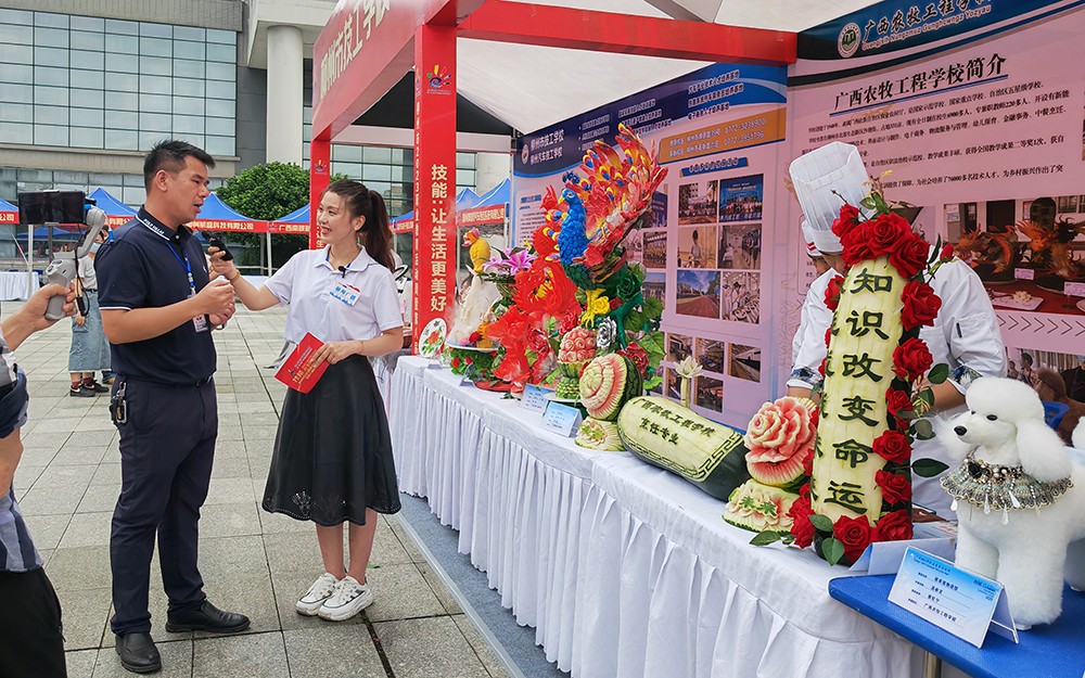 在联展活动中,我校招生就业办副主任韦必辉接受了柳州市广播电视台的采访,向记者介绍了学校近年来借助提质培优工程,不断加强人才培养,深化专业内涵建设,打造特色专业亮点,提升职业教育吸引力,在招生、就业和升学方面所取得突破性的成绩。