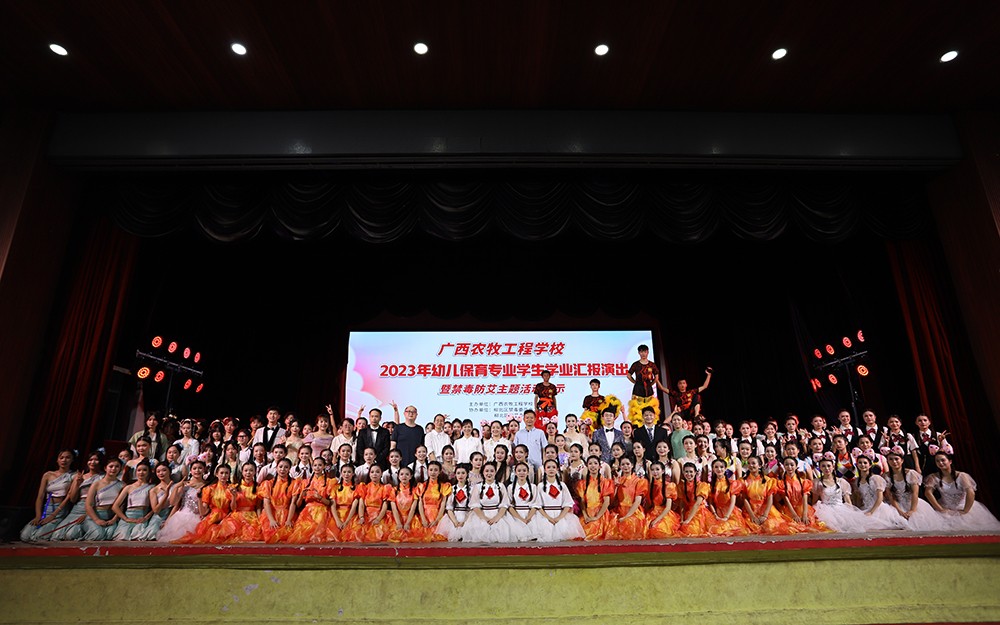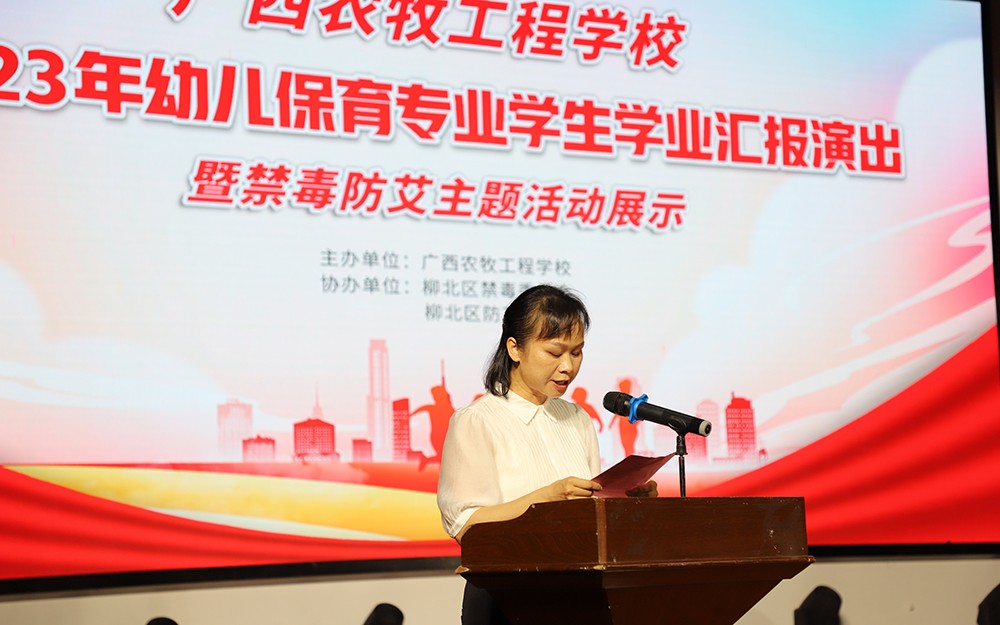 为检阅幼儿保育专业教学成果,充分展示我校幼儿保育专业师生专业素养和职业风采,结合柳州市“美好生活,民法典相伴”、12355“青春自护,有你有我”主题活动及6月份“禁毒防艾”主题教育月,我校于6月20日晚在学校大礼堂举行2023年幼儿保育专业学生学业汇报演出暨禁毒防艾主题活动展示。本次晚会得到柳北区委、区政府的大力支持。中共柳北区委书记、市二级巡视员、柳北区禁毒委主任刘俊,广西农牧工程学校副校长马翠芳,区委常委、政法委书记、区禁毒委副主任陈诚及柳北禁毒办、柳北防艾办、沙塘禁毒办相关部门领导,学校各职能部门负责人及全校6800名师生通过现场参与及分会场直播方式一同观看了演出。