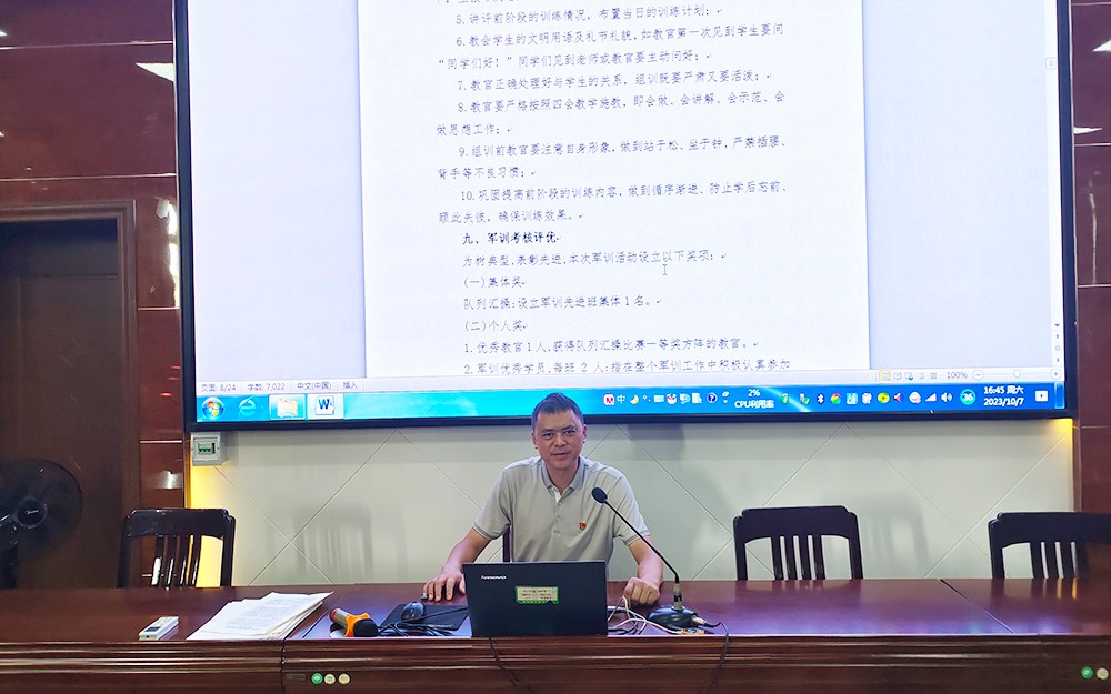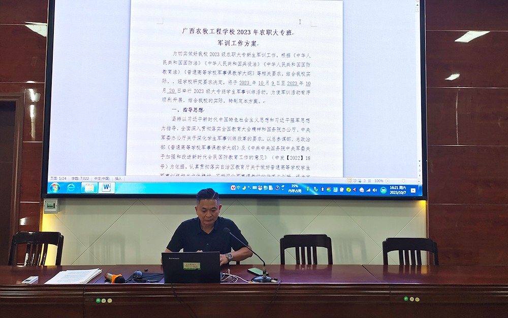 会上,何程老师解读了《广西农牧工程学校2023级农职大专班军训工作方案》,对军训工作进行了详细的布置,他指出大专生无特殊情况必须参加军训,班主任要做好学生的思想教育和管理工作,参训学生要严格遵守校纪校规,校内各部门要高度重视,积极配合军训工作,务必做好安全防范工作,保障军训工作顺利进行。