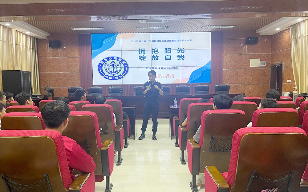 10月18日下午,依据《自治区农业农村厅直属院校心理健康教育项目服务方案》,在厅领导的关心下,委派蓝盾心理救援中心讲师团队到我校,在学术报告厅为学生开展青少年心理健康专题讲座,讲座分两场进行,由心理咨询师陈俊主讲。