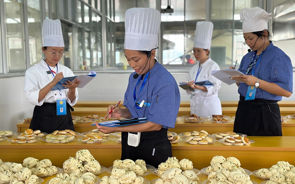 我校对本次考试工作非常重视,考试过程严格遵守工作流程,服务保障到位,考试系统稳定运行,考场秩序良好。本次考试分为理论考试和实操考试两部分,考试内容为1+x粤点制作的基础理论知识和葱油花卷、老婆饼、炸春卷3个作品的制作。考试过程中,考生操作认真、有条不紊;考评员考评公平公正、科学规范。
