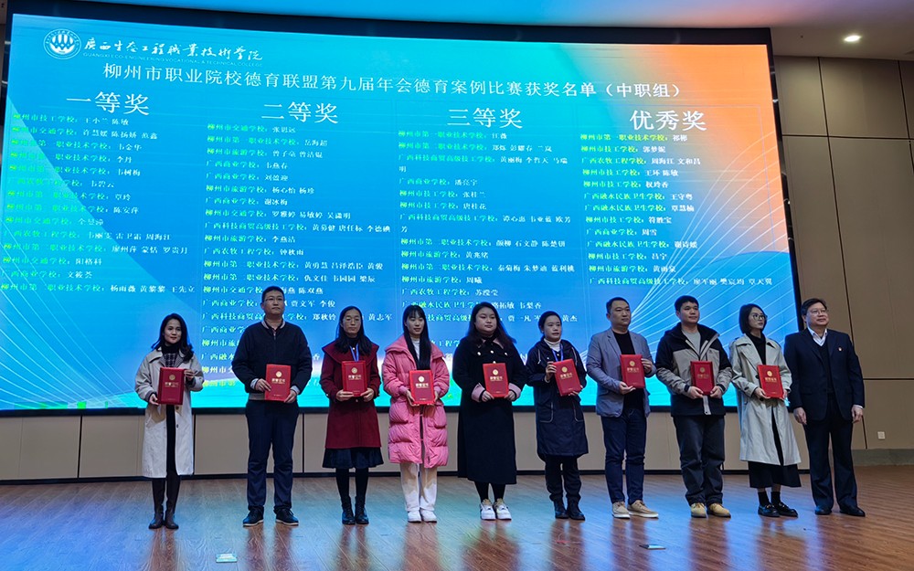 本次年会参加人员主要是柳州市教育局领导、特邀专家以及各职业院校德育工作者。首先,广西生态工程职业技术学院党委书记李振秋为年会致辞,柳州市教育局副局长、党组成员赵从奎发表讲话;接着,从“育新人,兴文化”“职业院校学生德育创新路径”“深耕重义与精商人才培养,构建三全育人新格局”“智媒体时代下网络思政教育”“念好六字诀,让主题团日有滋有味”五个方面进行德育论坛研讨;最后,进行颁奖环节,钟秋雨老师代表我校上台领奖。