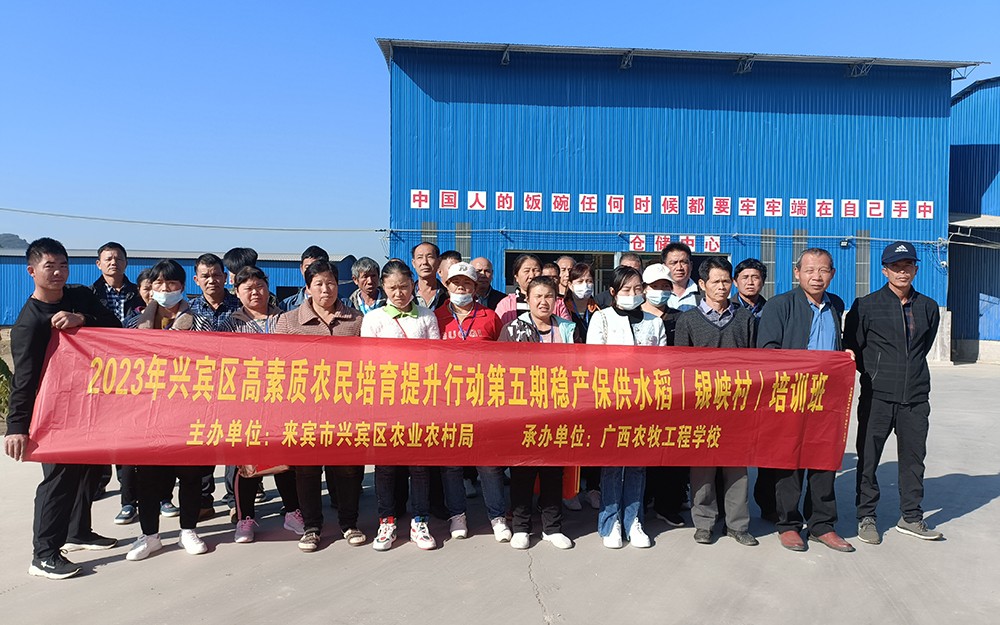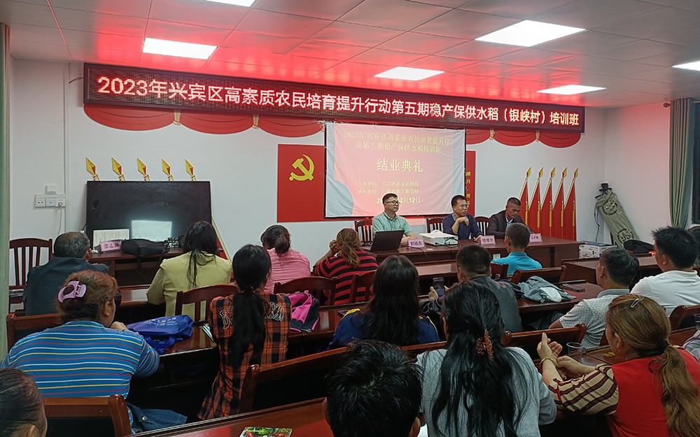 12月1-12日,由来宾市兴宾区农业农村局主办,我校承办的2023年来宾市兴宾区高素质农民培育提升行动第五期稳产保供水稻培训班在蒙村镇银峡村开班,共40名学员参加培训。