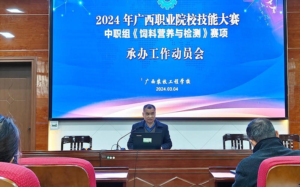 3月4日,我校组织全体教职工在办公楼一楼阶梯教室召开2024年广西职业院校技能大赛中职组《饲料营养与检测》赛项承办工作动员会。学校党委书记、校长蒋漓生,副校长李芳敏、瞿道航、马翠芳等领导出席会议。