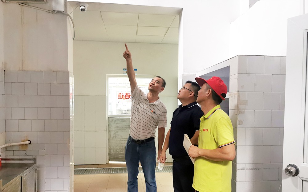 学校党委书记、校长蒋漓生(左一)到食堂检查指导工作