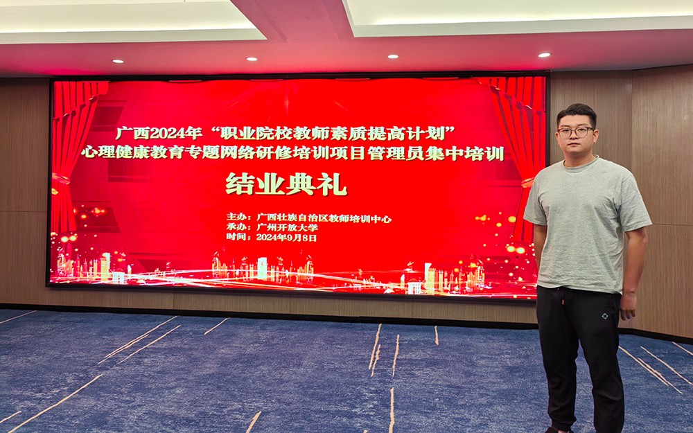 为进一步推进学校心理健康工作的科学化,规范化,全面提高教师的心理健康教育能力,9月7日-8日,我校教师文和昌参加了广西2024年“职业院校素质提高计划”--心理健康教育专题网络研修培训项目培训。