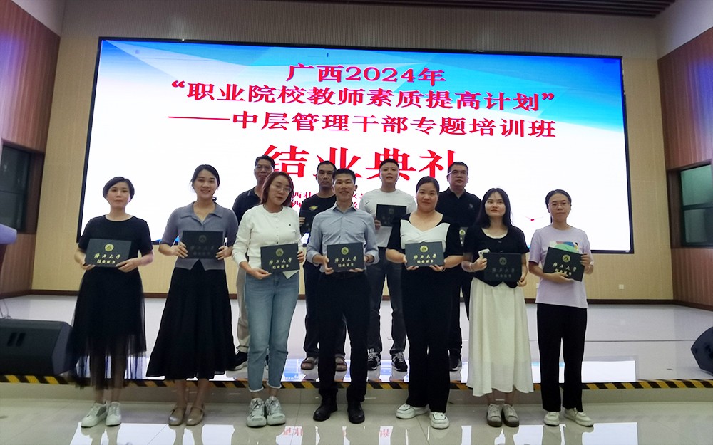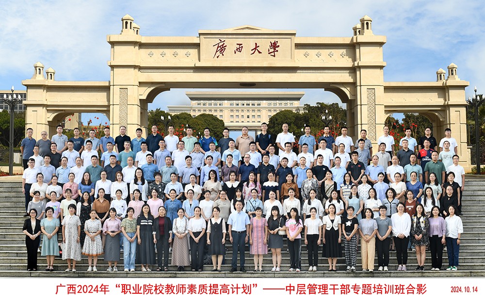 2024年10月13至19日,广西2024年“职业院校教师素质提高计划”——中层管理干部专题培训班在广西大学举办。培训班由广西壮族自治区教育厅主办,广西大学承办,来自全区中、高等职业院校150名教师参加本次培训,我校教师刘彤参加了此次培训。