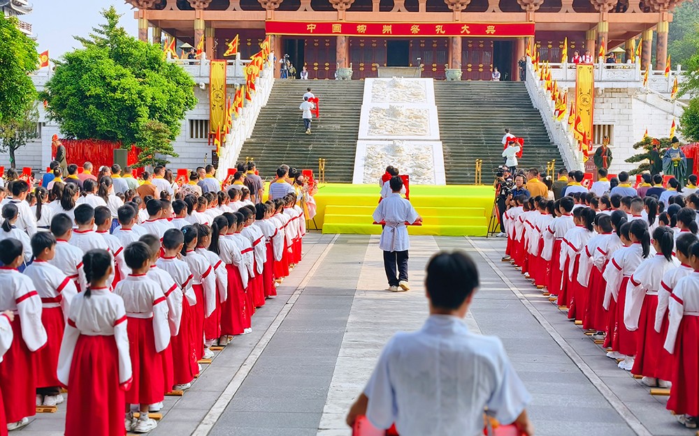 岁在甲辰,时维菊月。为纪念至圣先师孔子诞辰2575周年,9月28日上午9:00,由柳州市文化广电和旅游局主办、柳州文庙博物馆承办的2024年中国柳州祭孔大典在柳州文庙大成殿广场隆重举行。中共柳州市委宣传部、市委统战部、市政协文史委、市文化广电旅游局、团市委、市相关高校、中小学学生,以及市有关单位、社会团体等800余人参加了此次祭孔大典,我校副校长瞿道航、团委书记常姗姗带领80名志愿者参加此次祭孔活动。