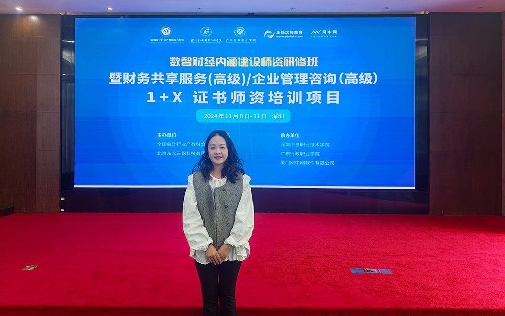 2024年11月8日至11日,由全国会计行业产教融合共同体及北京东大正保科技有限公司主办的“数智财经内涵建设师资研修班暨财务共享服务1+X证书师资”培训班在深圳信息职业技术学院举行,我校派出欧莹莹老师参加培训。