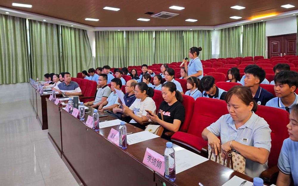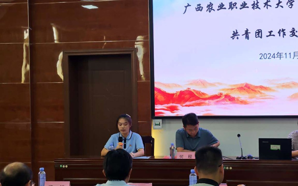 2024年11月15日,共青团广西农业职业技术大学委员会代表团在邹锦青校团委副书记(主持工作)的带领下,一行7人莅临我校交流共青团工作。我校瞿道航副校长、学生科科长何程以及校团委书记常姗姗、2023级、2024级全体农职大专班班主任,班团干、学生干部代表等40人参加座谈交流。