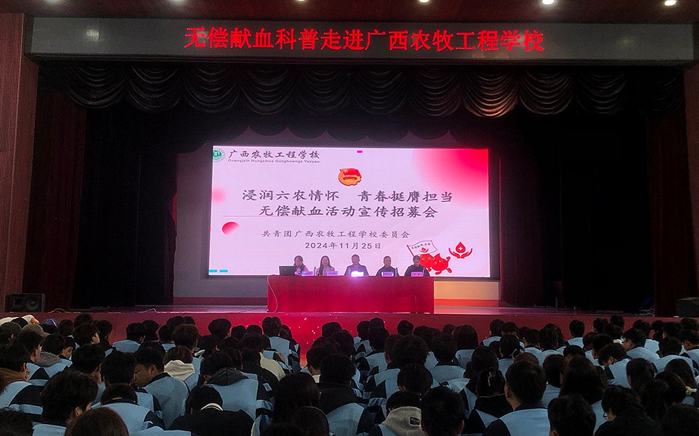 为了促进无偿献血活动的顺利开展,11月25日下午,校团委组织农职大专班、2022级等22个班级在大礼堂召开了无偿献血活动宣传招募会,首先团市委社联部部长余升致辞,为我校的青年学子们加油鼓励,接着广西血液中心采血科科长唐丽娟对血液相关知识及献血注意事项进行了宣讲,宣讲结束后,同学们纷纷表示积极参加献血活动。