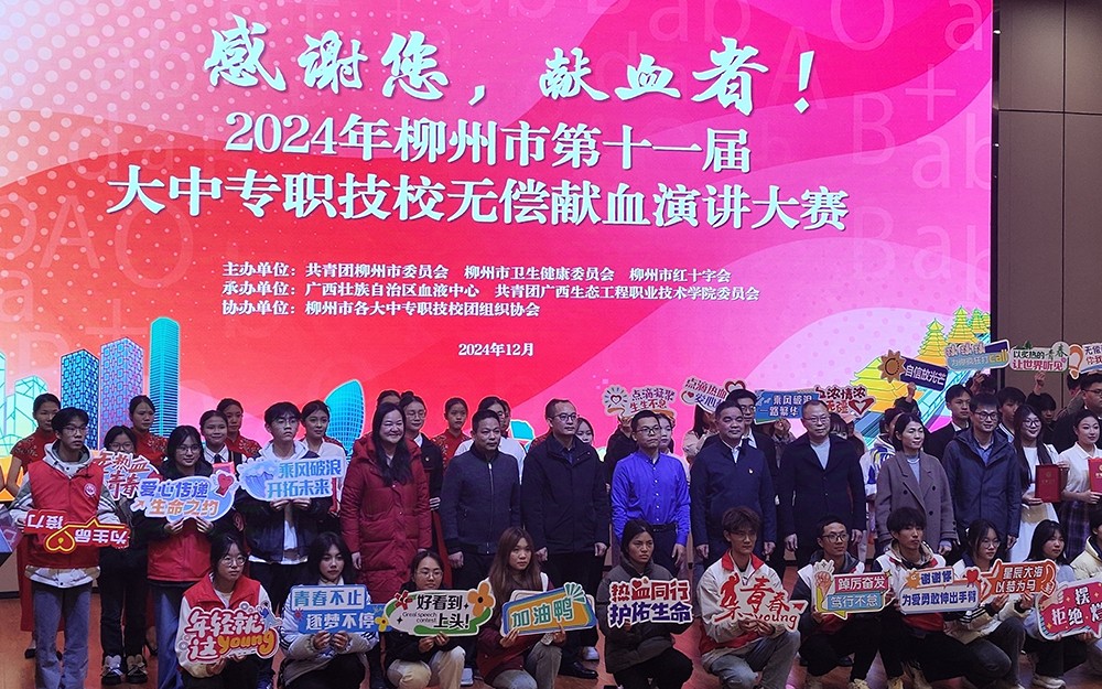 在这个寒冷的冬日,一股暖流在柳州市涌动。12月17日下午,由共青团柳州市委员会、柳州市卫生健康委员会、柳州市红十字会联合主办,广西血液中心、广西生态工程职业技术学院团委承办的“感谢您,献血者!”2024年柳州市第十一届大中专职技校无偿献血演讲大赛在广西生态工程职业技术学院知行报告厅温情上演。来自各大中专职技校的参赛选手及师生共600余人齐聚一堂,共同见证了这场关于爱与奉献的比赛。
