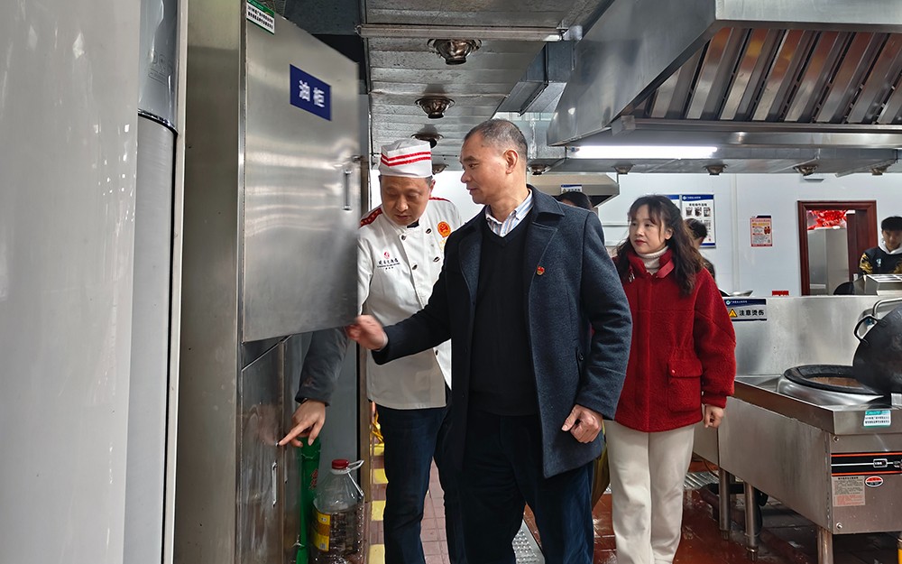 学校党委书记、校长蒋漓生(左二)带队排查烹饪实训室