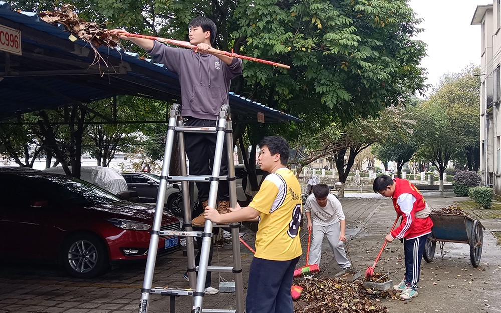 活动当天,志愿者们身着统一红色马甲,手持扫把、刷子、水桶、抹布等工具,分成教室清洁组、公共区域组、宿舍清洁组等多个小队,对教学楼、宿舍区、操场、绿化带等区域展开“地毯式”清理。 在教室清洁组,志愿者们仔细擦洗教学楼围墙瓷砖、清理死角积灰;公共区域组重点刷洗爱书亭、校园垃圾桶、校园宣传牌、非遗文化长廊、劳动教育长廊、团员教育长廊、路牌、灯柱等;宿舍清洁组则对宿舍外墙、花坛杂草、车棚顶树叶进行清理。
