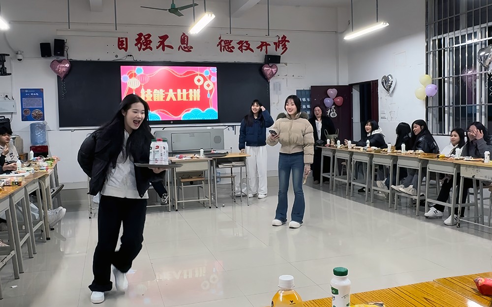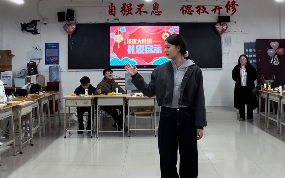 技能比拼,以专业彰显实力。为检验实习成果,座谈会特别设置了“旅游服务技能比拼”环节。同学们分组展示了托盘举物、礼仪接待等专业技能。参赛选手动作娴熟、操作规范,引得现场掌声不断。评委组从效率、规范性和难度系数三方面进行评分,最终评选出“技能之星”,并给与砸金蛋奖励。