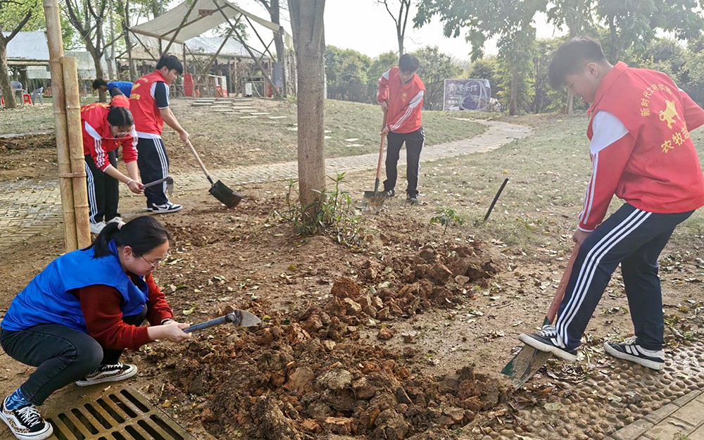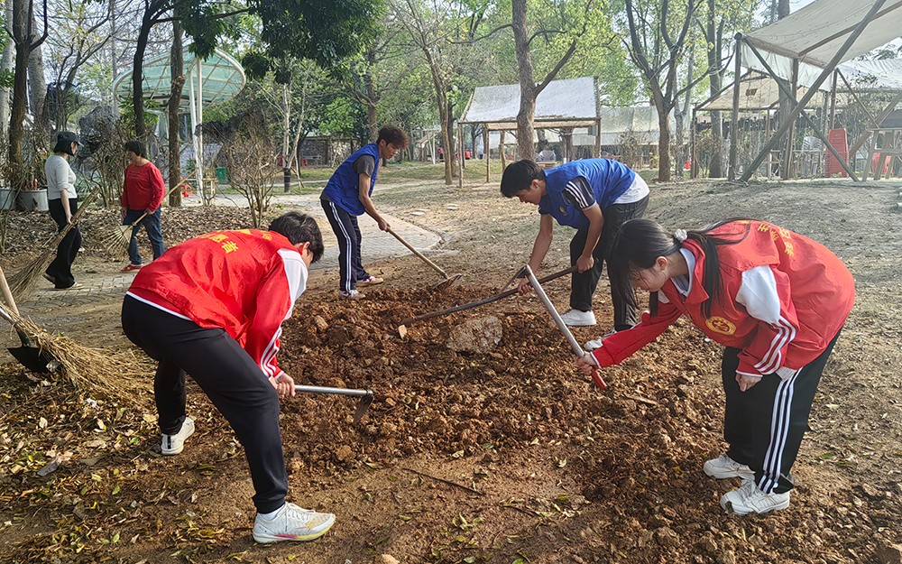 在园区技术人员的指导下,志愿者们迅速投入“春耕三部曲”作业。面对板结严重的草皮地和混杂砾石的硬质土层,同学们挥动锄头破除旧土,接力筛拣碎石,接力传递改良土壤。伴着此起彼伏的“我来接力”“小心碎石”的提醒声,改良后的松软土层渐次铺展。随后,大家采用“十字交叉法”精细撒播草籽,确保每平方米播种量精确到克,最后浇灌。
