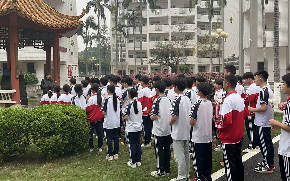 在古香古色的爱书亭,在和蔼可亲的马老校长雕像前,师生代表清扫落叶、擦拭雕像、敬献白菊,并集体鞠躬默哀。班主任韦老师致辞时表示:“马保之先生将毕生奉献给农业科学与教育,他的精神激励我们以“强农兴邦”为己任,为乡村振兴贡献力量。